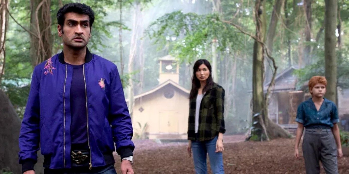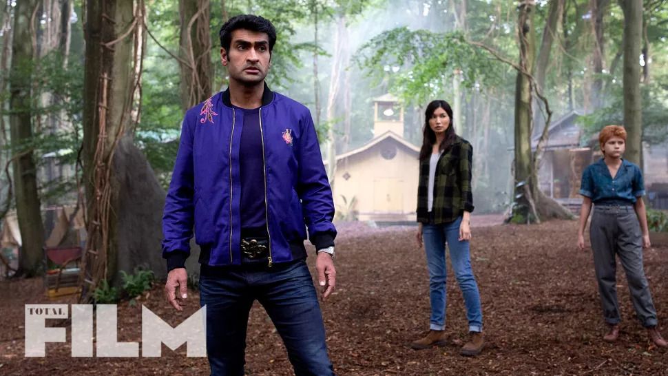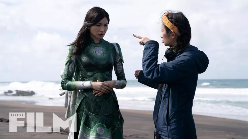In a new cover feature in Total Film magazine, (via Games Radar), exclusive new Eternals images were released, showing off the team's superhero and modern day costumes. One image shows Zhao giving direction to Gemma Chan, who wears a striking green superhero costume. Another image features Nanjiani, Chan, and McHugh in regular street clothes in a small village in the woods, with Nanjiani donning a bold purple jacket and jeans. The final image, in addition to showing Nanjiani, Chan, and McHugh, also provides a glimpse of Madden, Jolie, and Lee in their modern day costumes. Check out the new images below: