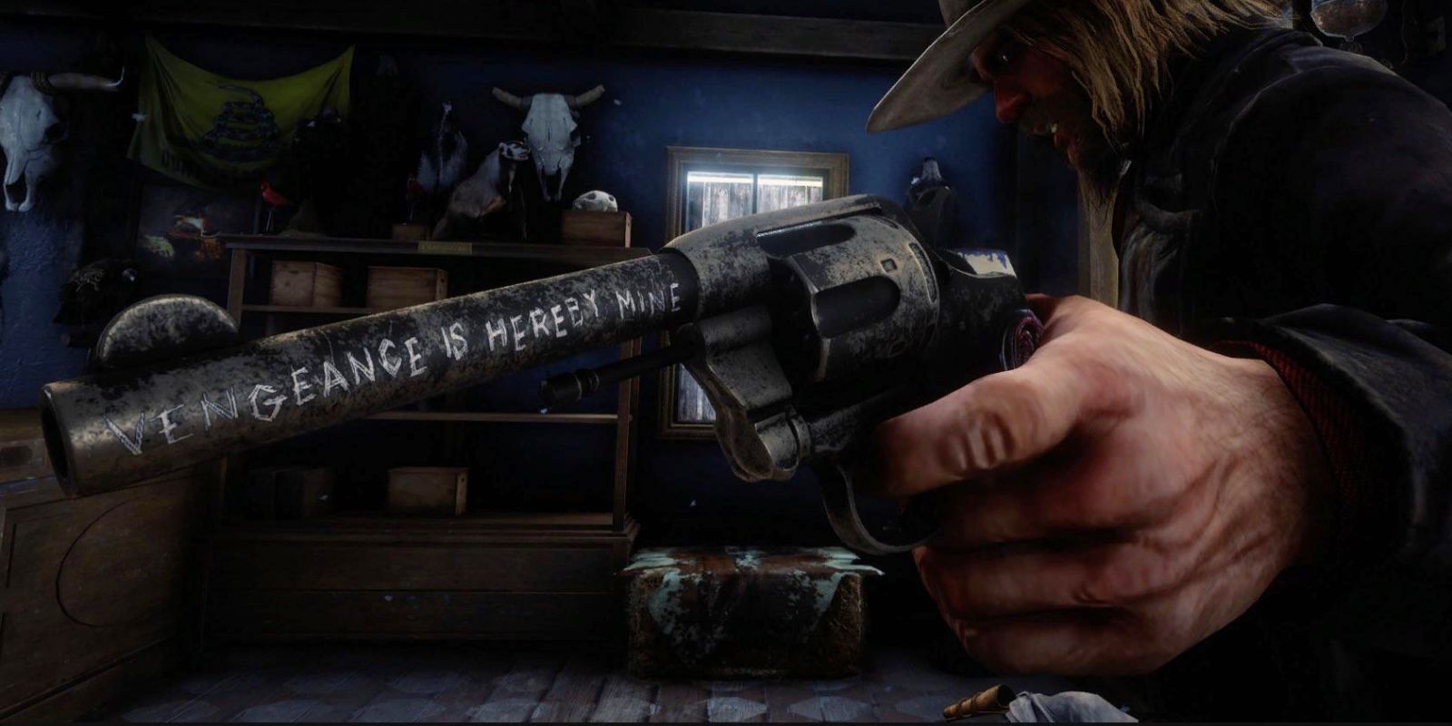 Although Micah's Double-action Revolvers have black handles sporting bright red skull ornamentations, the most notable aspect of the weapons is the phrase "VENGEANCE IS HEREBY MINE" etched into one of the barrels. This gun can actually be acquired by players if they return to where Micah is killed on Mount Hagen near the end of Red Dead Redemption 2. Micah's weapons being a reflection of his personality is best summarized by one of Arthur's more famous quotes: "Vengeance is an idiot's game."